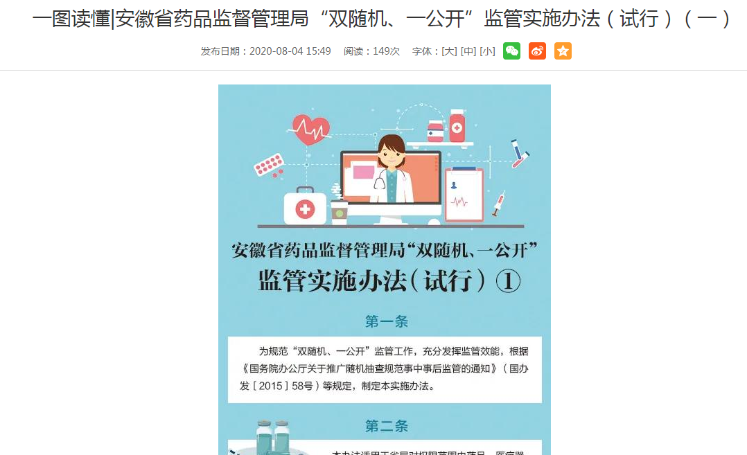 (三)政府信息管理情况。一是编制药品领域基层政务公开指引目录。根据《安徽省人民政府办公厅关于印发2020年政务公开重点工作任务分工的通知》(皖政办秘〔2020〕66号)和市场监管总局印发的食品药品领域基层政务公开标准指引和我省梳理指南,编制完成了我省药品领域基层政务公开事项指引目录。二是围绕做好“六稳”“六保”工作,加强政策发布解读。今年省局重点对《918博天堂发布省级药品质量抽检公告管理规定》《918博天堂“双随机、一公开”监管实施办法(试行)》《安徽省药品行政处罚裁量基准(试行)》《服务安徽省药品医疗器械产业高质量发展若干措施》四个政策性文件进行了解读。三是围绕优化营商环境加强政务信息公开,进一步深化“放管服”改革,优化营商环境,简化优化政务服务流程,提升政务服务效率和质量。自4月20日起,省本级所有政务服务事项实行“全程网办”,办件办理状态可在安徽省政务服务网实时查询,行政许可结果实时推送到“信用安徽”双公示栏目。截止12月底,共发布信息5628条,真正实现政务服务事项“透明化、无纸化、不见面”审批新模式。