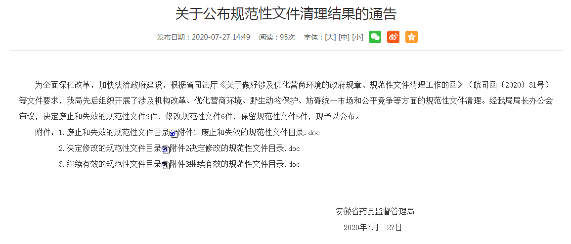 强化重点环节信息公开。开展规范性文件“立改废”工作,2020年7月27日公布清理结果,废止和失效的规范性文件9件,修改规范性文件6件,保留规范性文件5件,现行有效的规范性文件均在相应栏目及时公开。药品安全监管城乡一体化建设经费项目、药品(含医疗器械、化妆品)抽验经费项目全部公开。按照规定,做好公共资源交易过程信息、中标(成交)信息、合同订立、履约及变更信息的公开工作。发布审计和整改信息。主办省人大代表建议3件、省政协委员提案2件,已全部在规定时限内办结,办理结果均为满意,并已按照规定在局网站专栏公开。