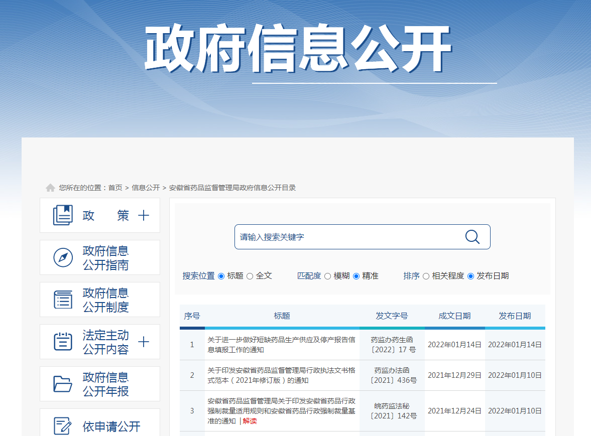 (一)主动公开情况。2021年,主动公开信息810条。根据人员调整及时补充完善机构设置信息,公开《安徽省“十四五”药品安全发展规划》、药械化监督检查、不良反应监测等信息,完成权责清单、公共服务清单和中介服务清单的年度集中调整和即时动态调整工作,做好行政许可和行政处罚双公示、信用信息等专门系统的信息录入工作。