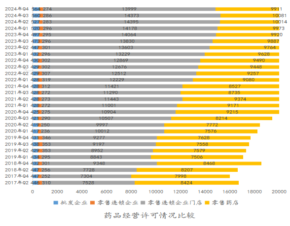 截至2024年12月底,全省共有药品经营许可证持证企业24823家,其中:法人批发企业545家、非法人批发企业19家、零售连锁企业274家、零售连锁企业门店13999家、零售药店9911家。